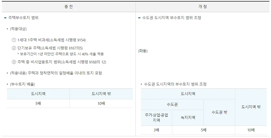 1세대 1주택 양도소득세 비과세 적용대상 부수토지 범위 조정 : 수도권 도시지역(주거·상업·공업 지역) 주택 부수토지 범위가 주택 정착면적의 5배에서 3배로 조정