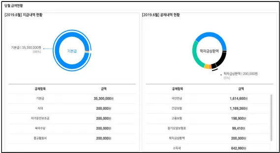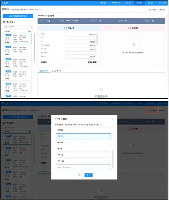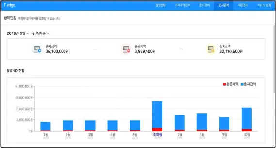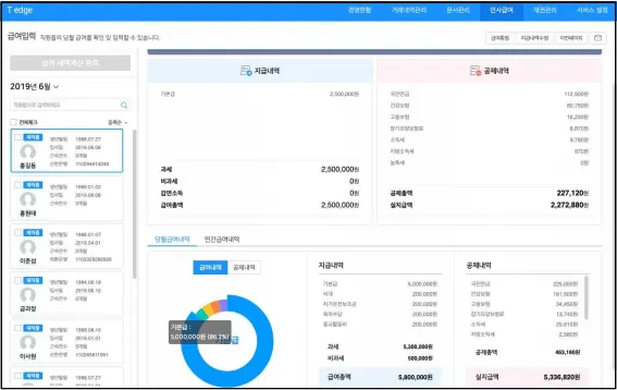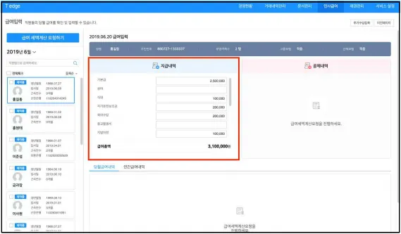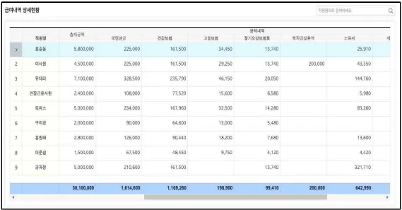 급여현황에서는 앞의 3.에서 계산이 완료된 급여내역 현황을 조회할 수 있습니다.