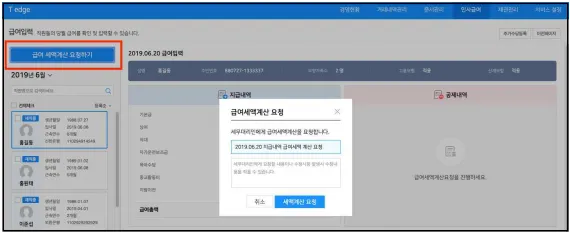 직원들의 당월 급여를 확인 및 입력하여 세무회계 프리미어에 급여세액계산요청을 하는 메뉴입니다. 수임고객사에서는 지급내역만 입력할 수 있습니다.