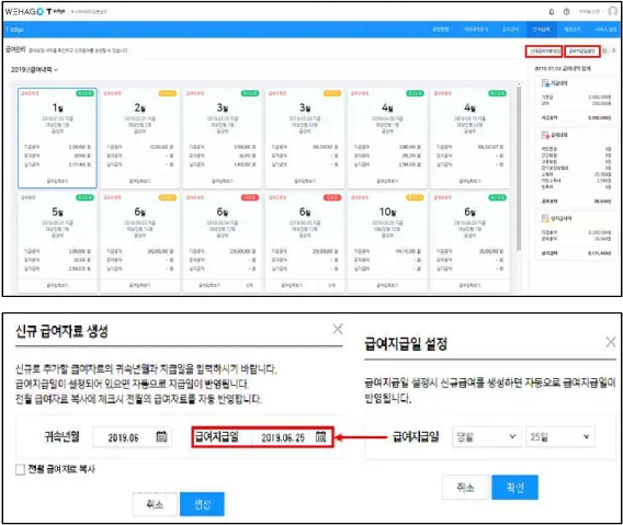 급여지급일 설정 : 급여지급일을 지정하여 신규급여를 생성하면 급여지급일이 자동 반영 됩니다.