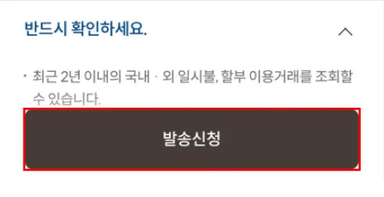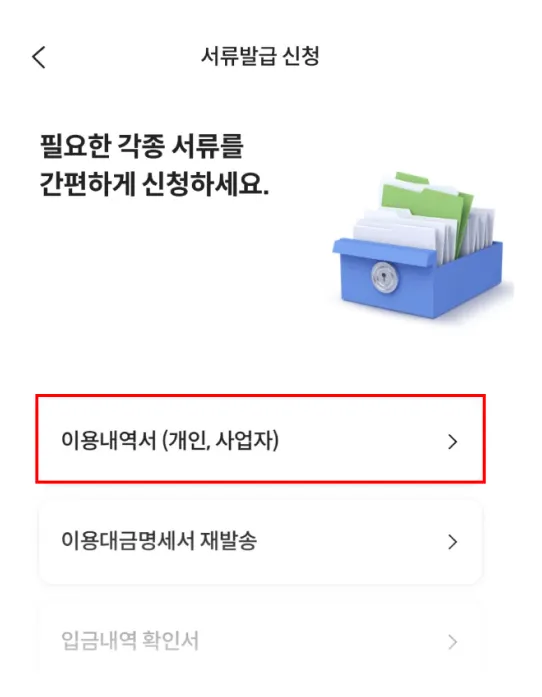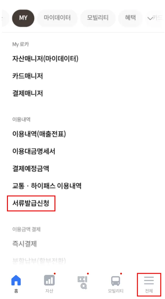 롯데카드 앱 실행 → 하단 전체메뉴 → 이용내역 → 서류발급신청 클릭