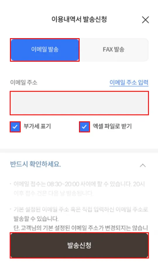 이메일발송 → 이메일주소에 본인 메일주소 입력 → 부가세 표기 체크 → 엑셀 파일로 받기 체크 → 발송신청 클릭