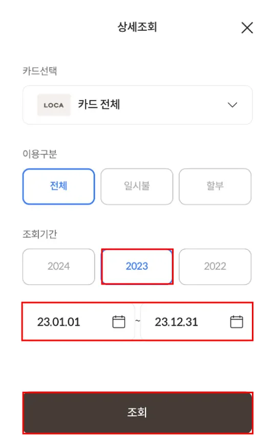 조회기간 2023 → 23.01.01 ~ 23.12.31 입력 → 조회 클릭