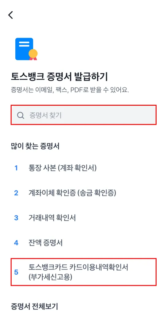 또는 많이 찾는 증명서 항목에서 토스뱅크카드 카드이용내역확인서(부가세신고용) 클릭