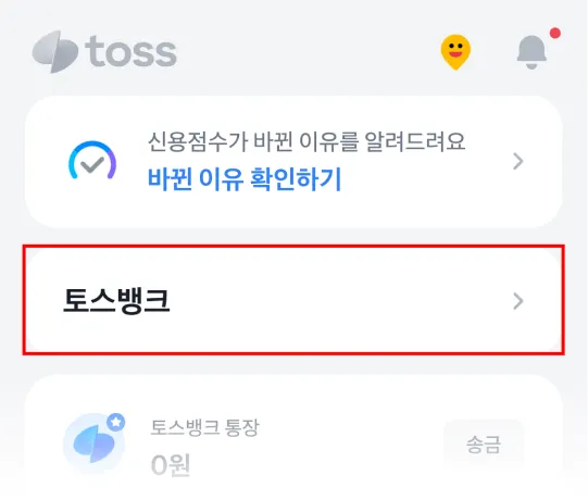 토스뱅크 앱 실행 → 홈 → 토스뱅크 클릭