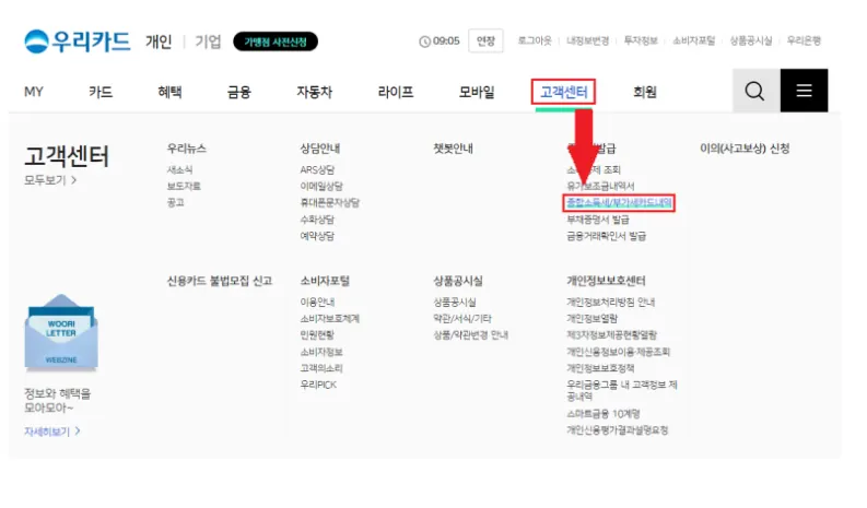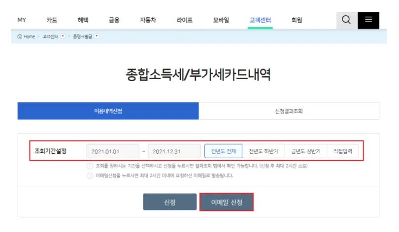 [로그인] - [고객센터] - [종합소득세/부가세 카드내역]을 눌러주세요.