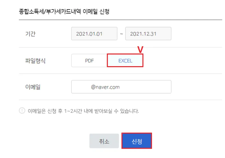 기간등이 맞는지 확인 후, 엑셀 파일로 변경하여 이메일로 신청합니다.