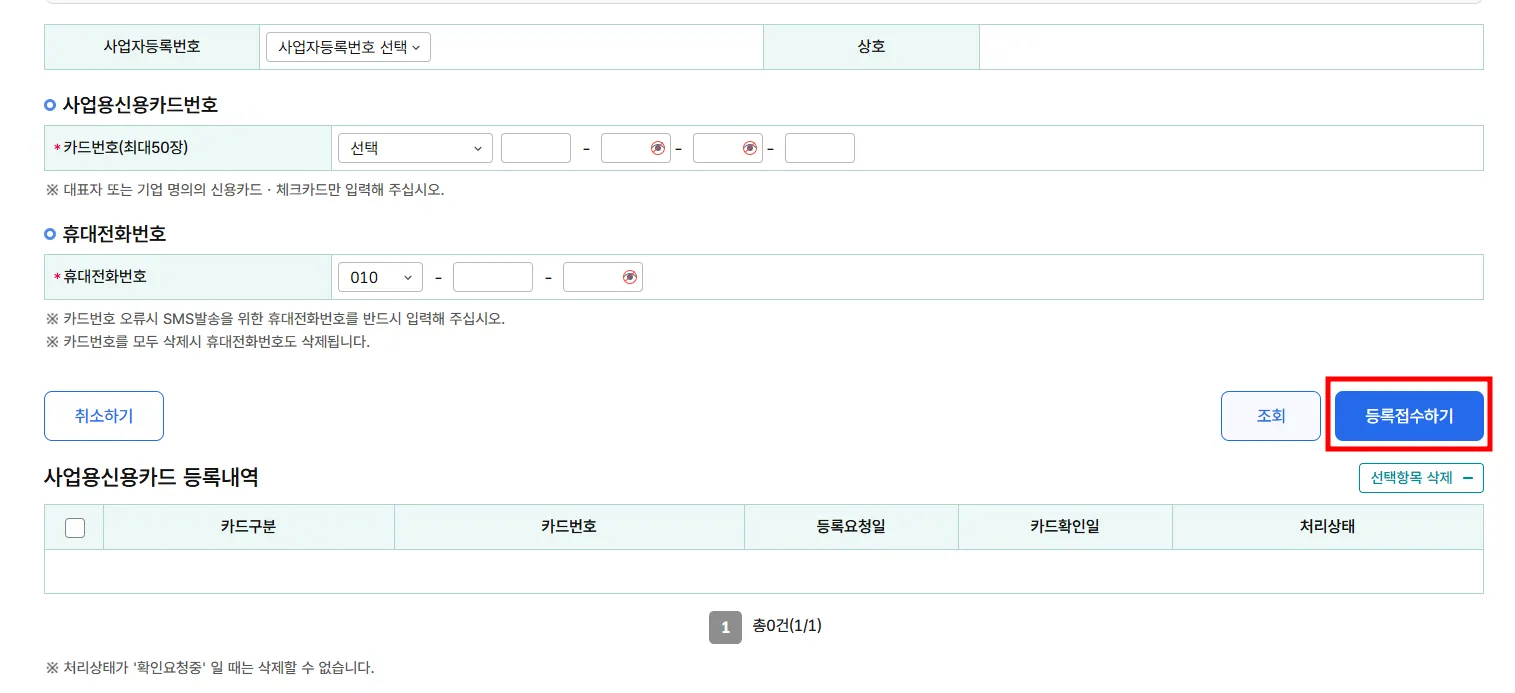 개인정보제공에 동의하시고 카드번호와 휴대전화번호를 기입하신 뒤 등록접수하기 버튼을 클릭해주세요.