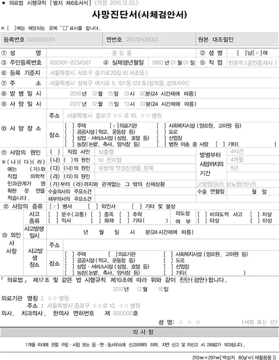 진단서 또는 사체검산서 등 사망의 사실을 증명하는 서류