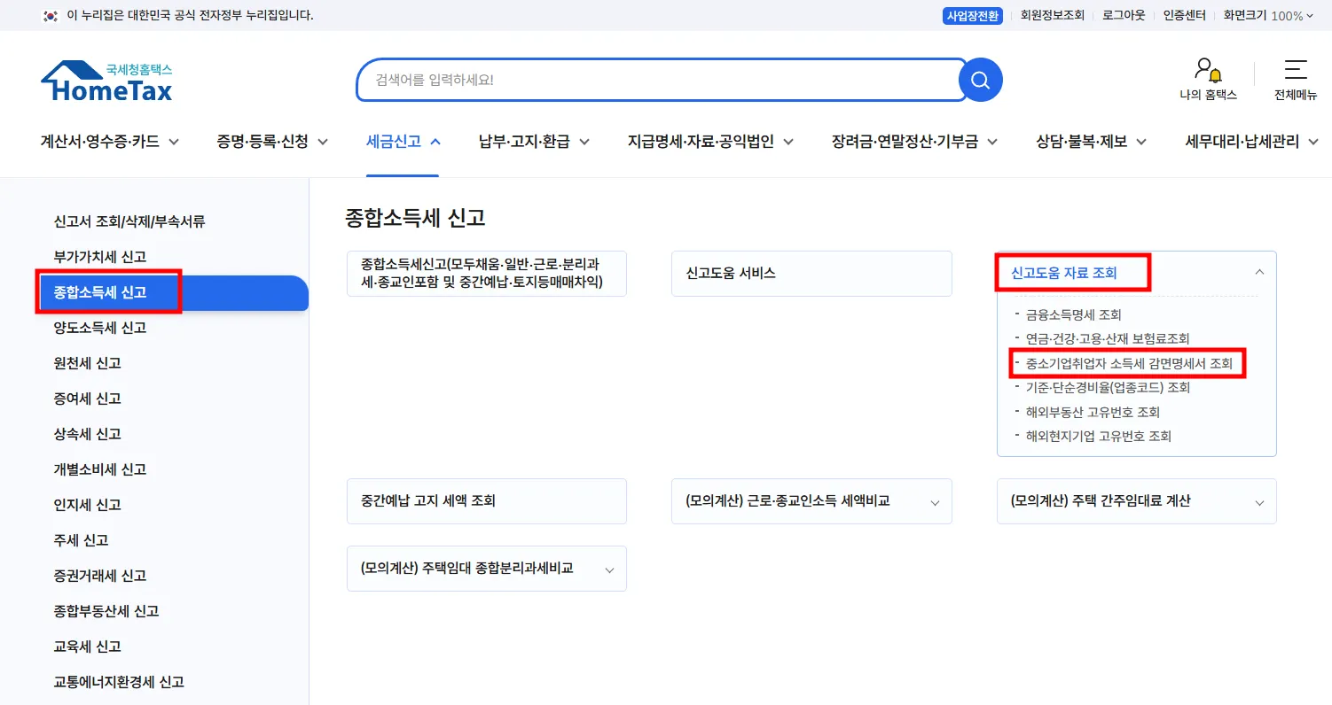 홈택스 > 종합소득세 신고 > 신고도움 자료 조회 > 중소기업 취업자 소득세 감면 명세서 조회
