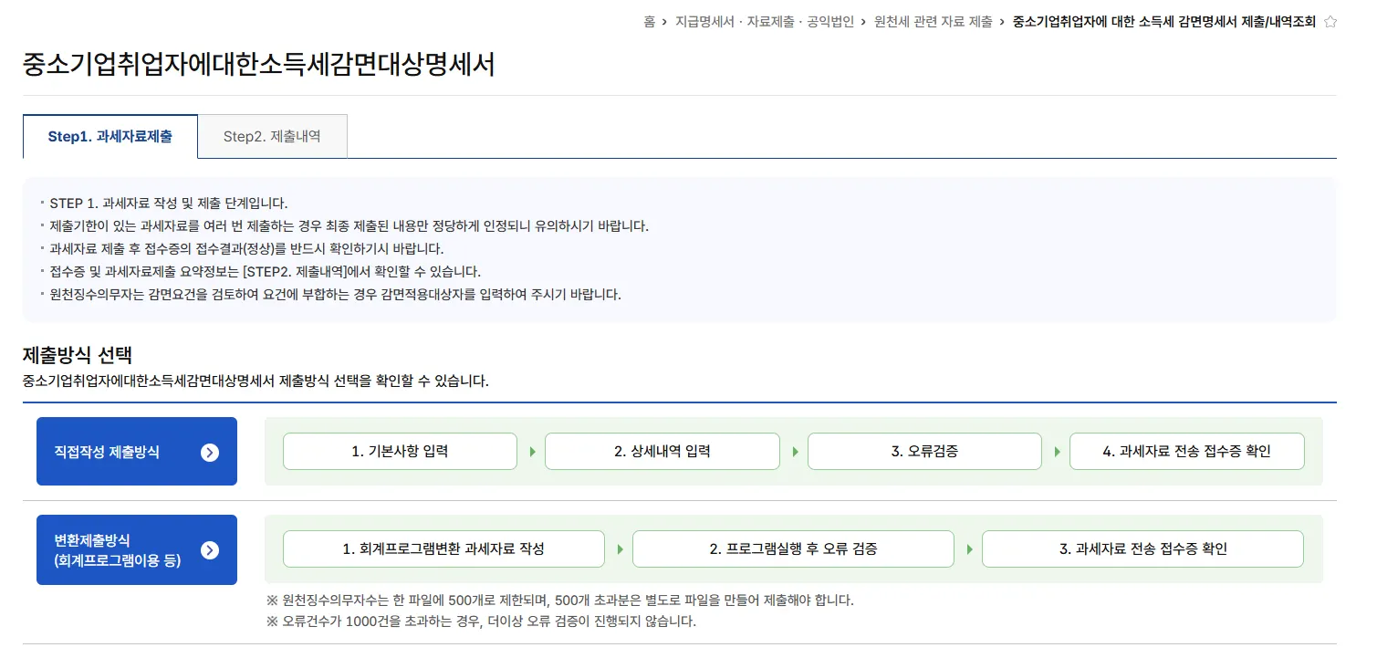 지금명세º자료º공익법인 > 과세자료 제출 > 원천세 관련 자료 제출 > 중소기업취업자에대한소득세감면대상명세서
