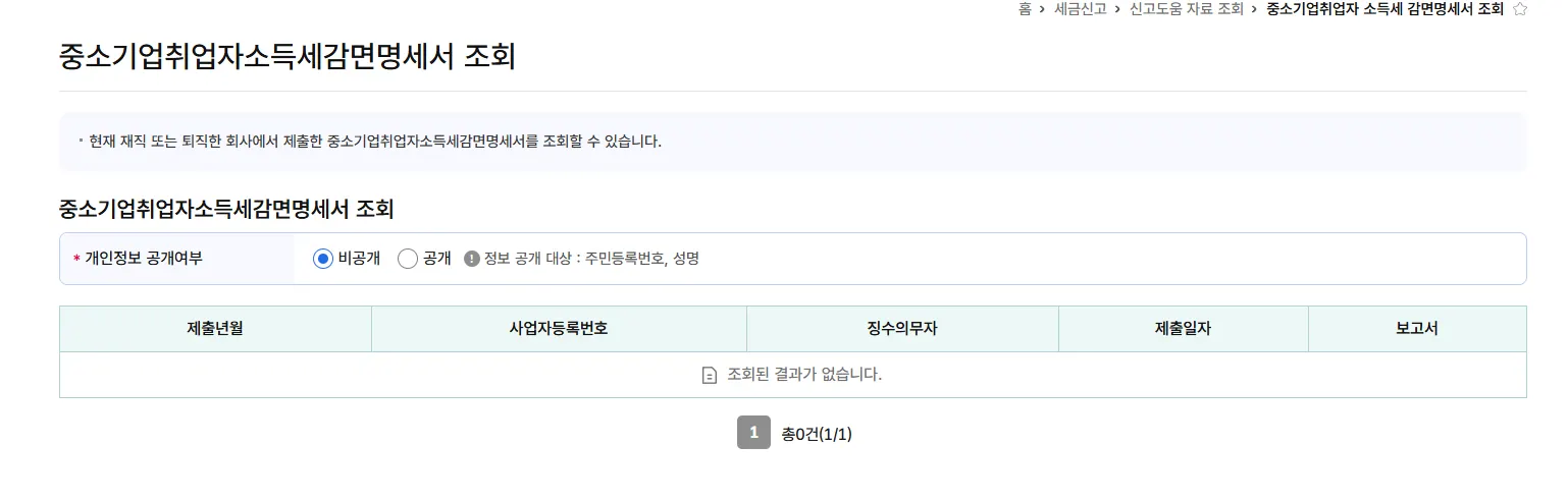 홈택스 > 조회/발급 > 기타조회 > 중소기업 취업자 소득세 감면 명세서 조회