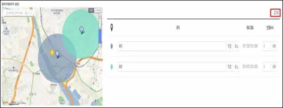 위치 이름과 허용 범위(반경 km)을 설정합니다.(최대 10개까지 가능)