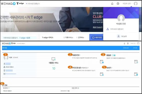 개인정보관리 : WEHAGO T edge에 접속한 사용자의 개인정보를 확인·수정할 수 있습니다.