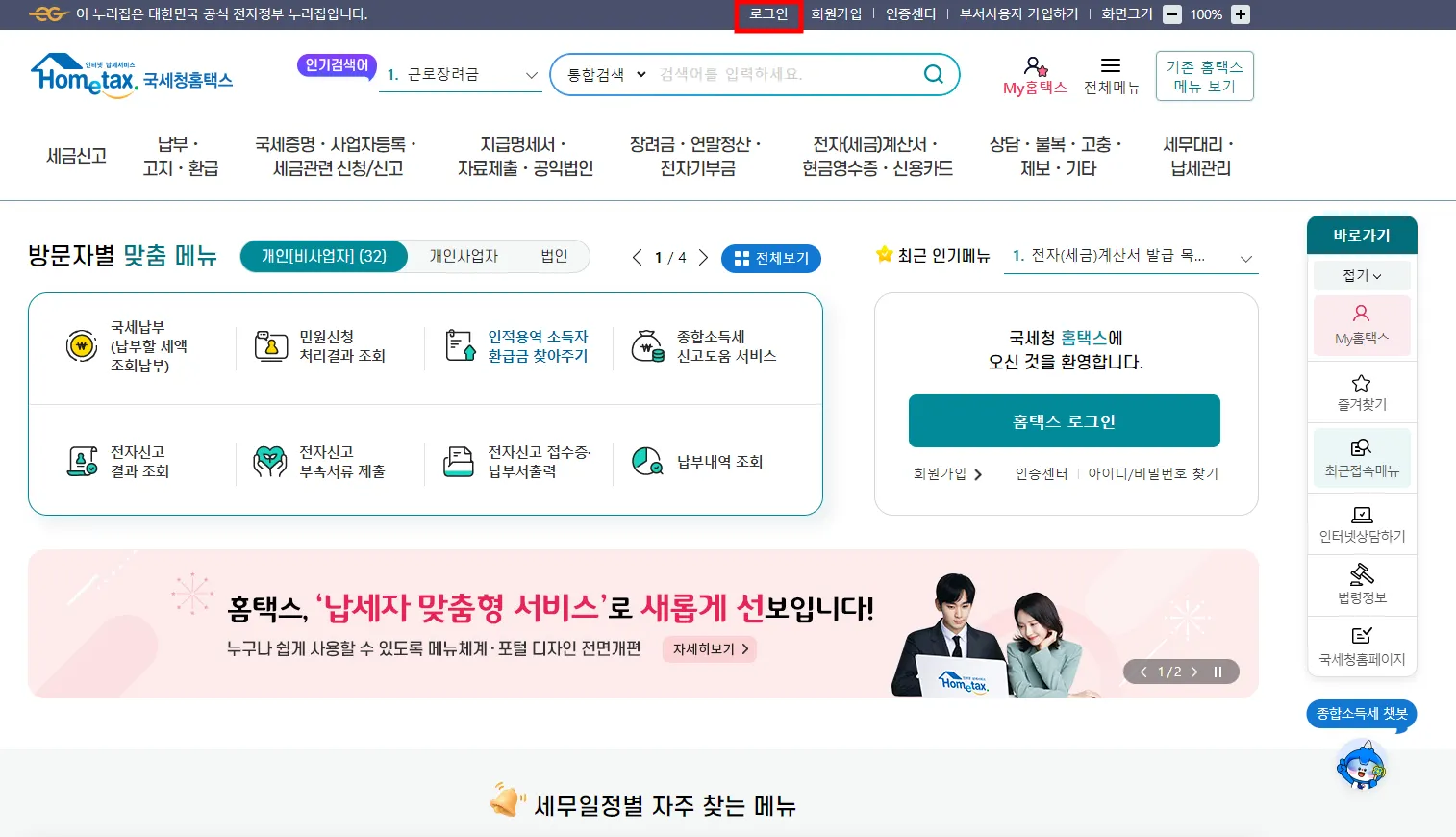 홈택스 홈페이지 접속 → 공동인증서 or 간편인증 로그인 클릭
