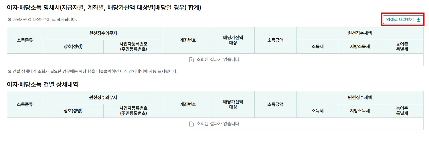 이자 배당 소득 조회 후 엑셀로 내려받기하고 엑셀 파일 전달