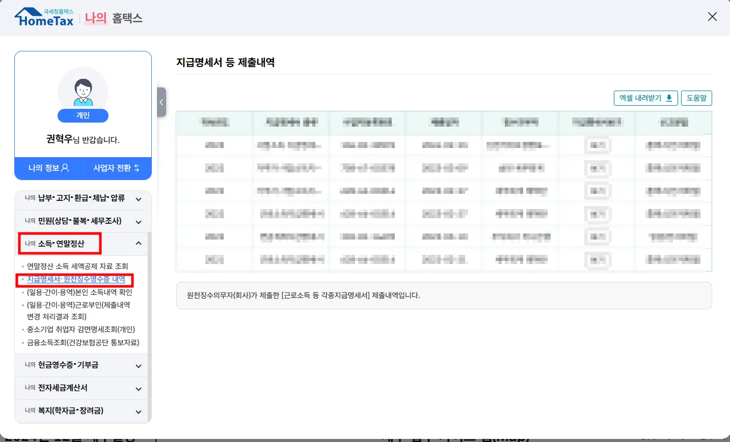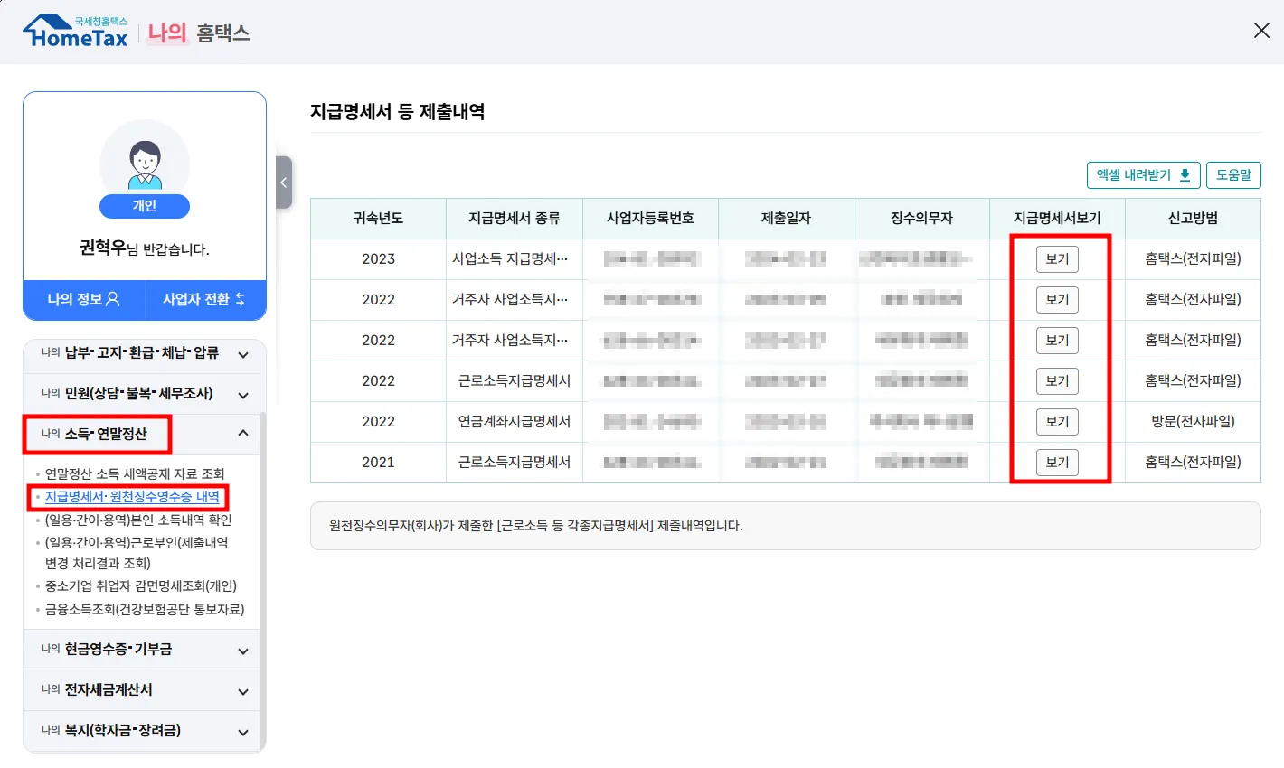 근로, 퇴직, 사업, 기타소득 등 지급명세서 원천징수 확인 방법