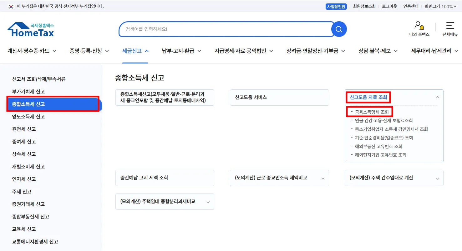 세금신고 - 종합소득세 - 신고도움 자료 조회 - 금융소득명세 조회