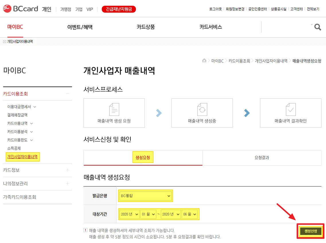 조회하려는 기간을 선택하고 오른쪽 생성신청 버튼을 눌러주세요.
