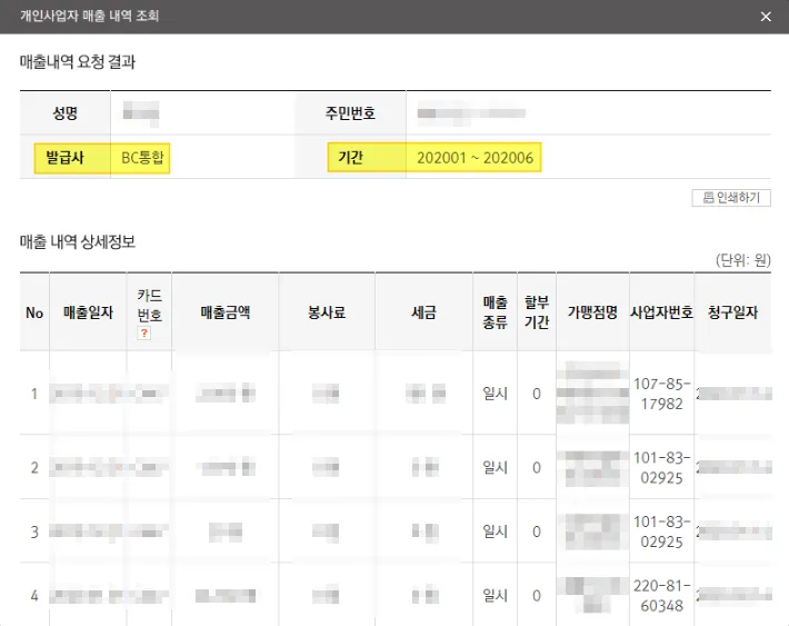 아래 매출 내역에서 이용 일자, 이용 금액, 가맹점명, 상대방 사업자등록번호를 확인하실 수 있습니다.