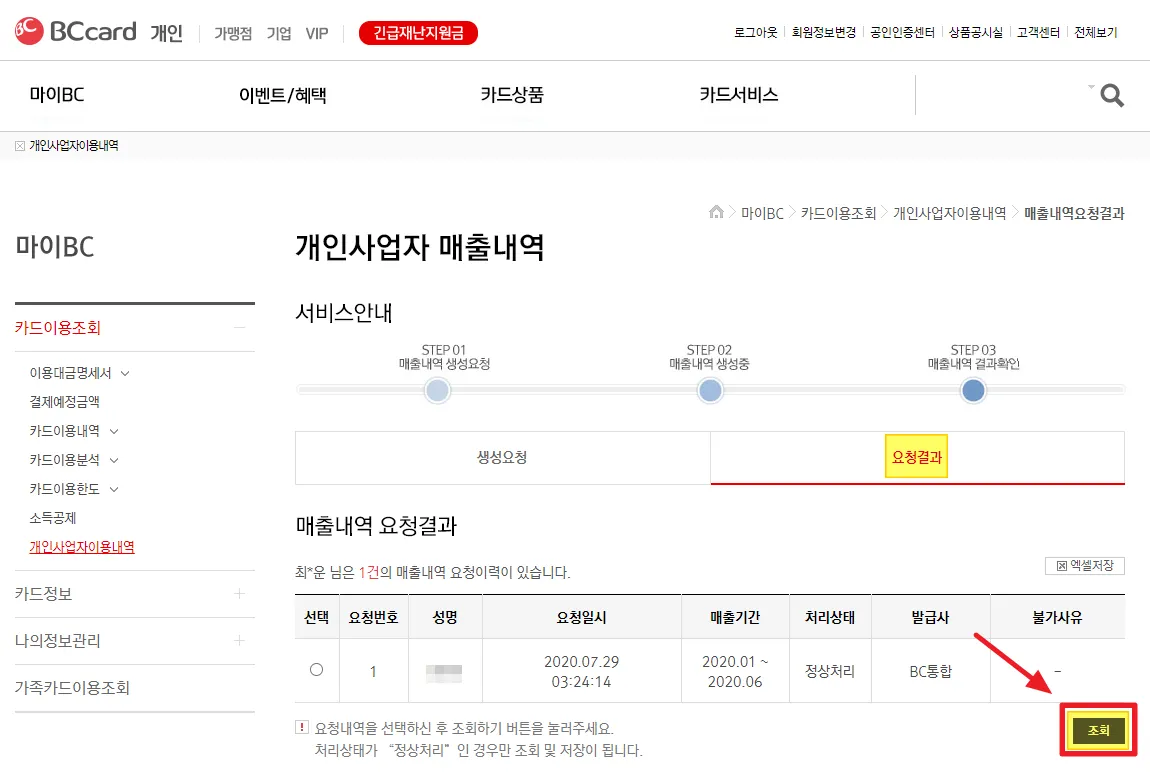[요청결과] 탭으로 들어가면 가운데 처리 상태란에 정상처리라고 뜨는데, 오른쪽 아래의 조회 버튼을 눌러주세요.