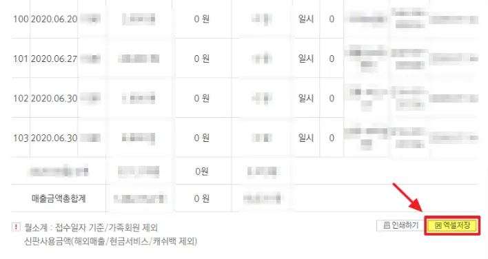 조회된 내역 맨 아래 엑셀저장을 누르면 이용 내역을 엑셀 파일로 저장할 수 있습니다.