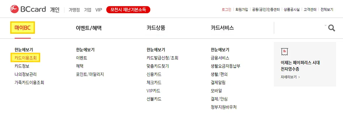 [마이BC] - [카드이용조회]를 눌러주세요.