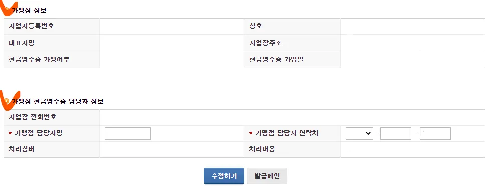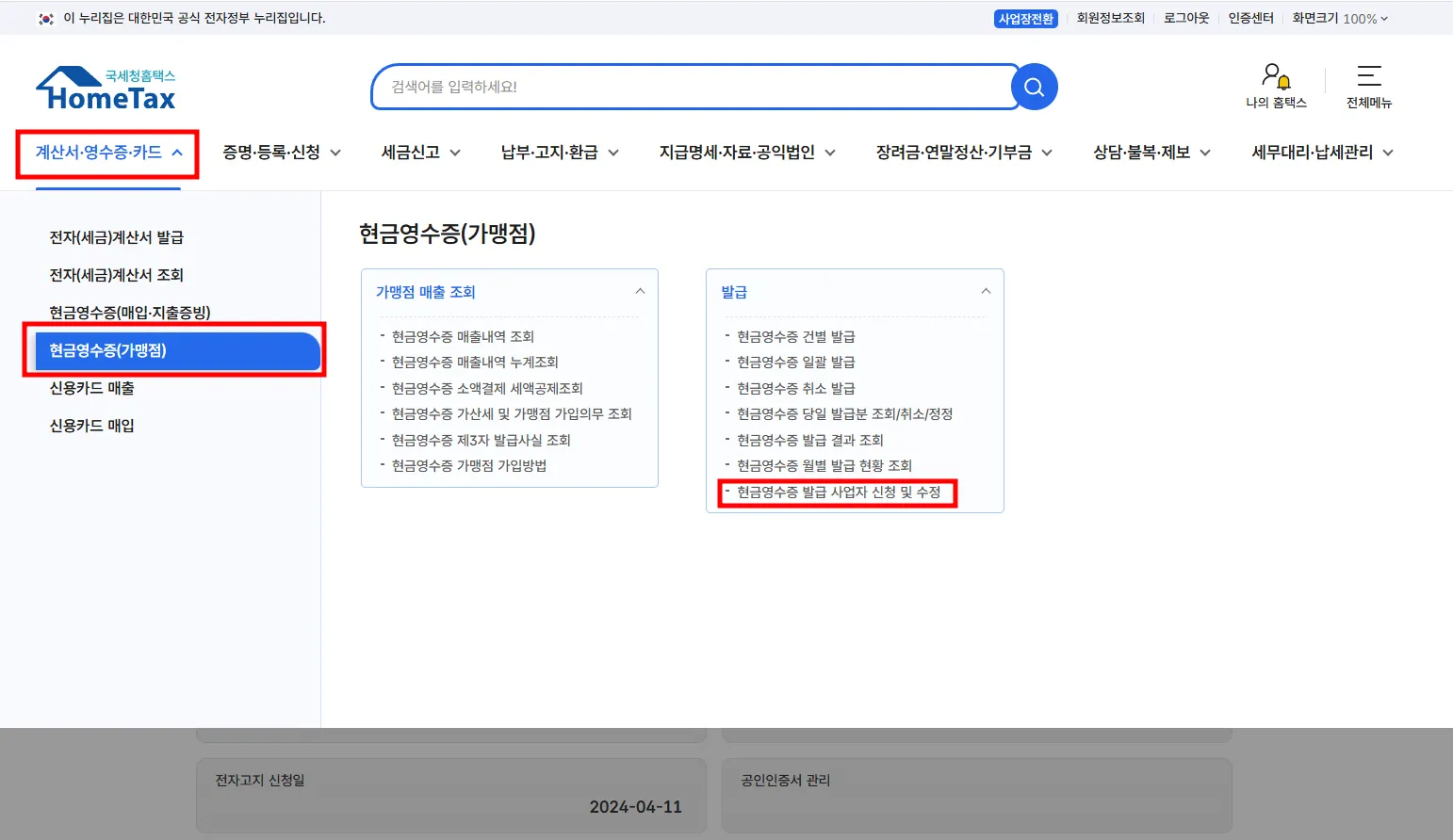 홈택스 로그인 → 전자세금계산서/현금영수증/신용카드→ 현금영수증(가맹점) → 발급 → 현금영수증 발급 사업자 신청 및 정보수정 클릭