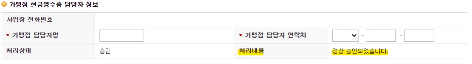 현금영수증 가입승인이 되면 입력한 연락처로 승인완료 안내 메세지가 발송됩니다.