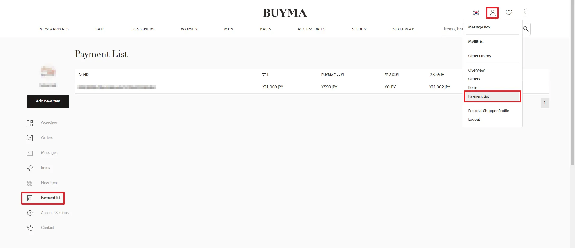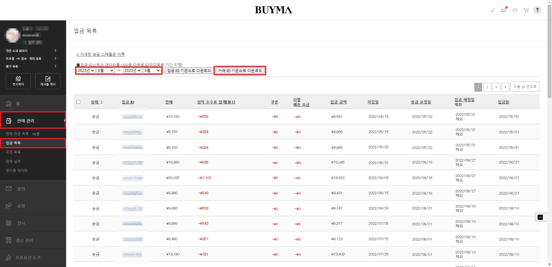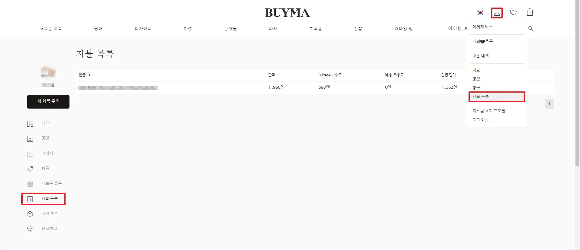 아래 이미지를 참고해서 [지불 목록(Payment List)] 메뉴로 들어가면 판매 금액, 바이마 수수료, 배송비, 최종 입금액 및 입금 날짜를 확인할 수 있어요.