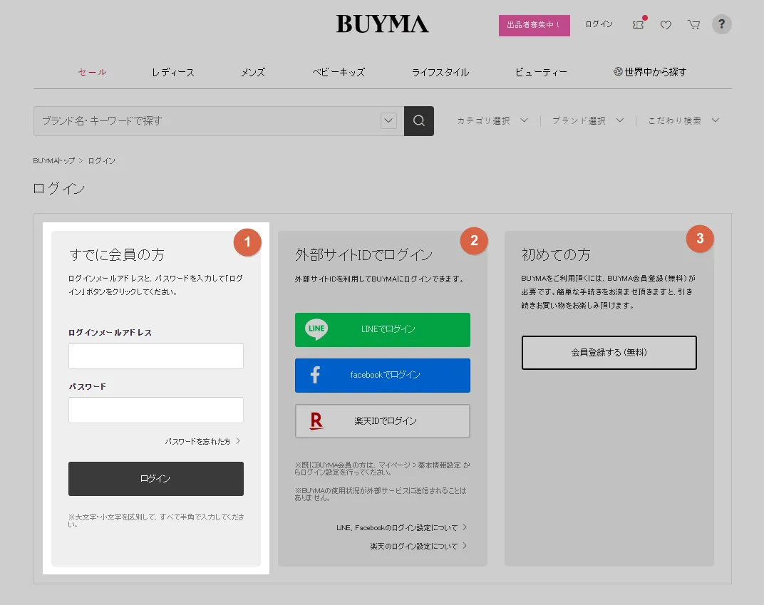 기존 계정이 있다면 아래 이미지의 ①번에서 라인/페이스북/라쿠텐 계정으로 로그인하려면 ②번에서 로그인하고 계정이 없다면 ③번에서 회원 가입 후 진행해주세요.