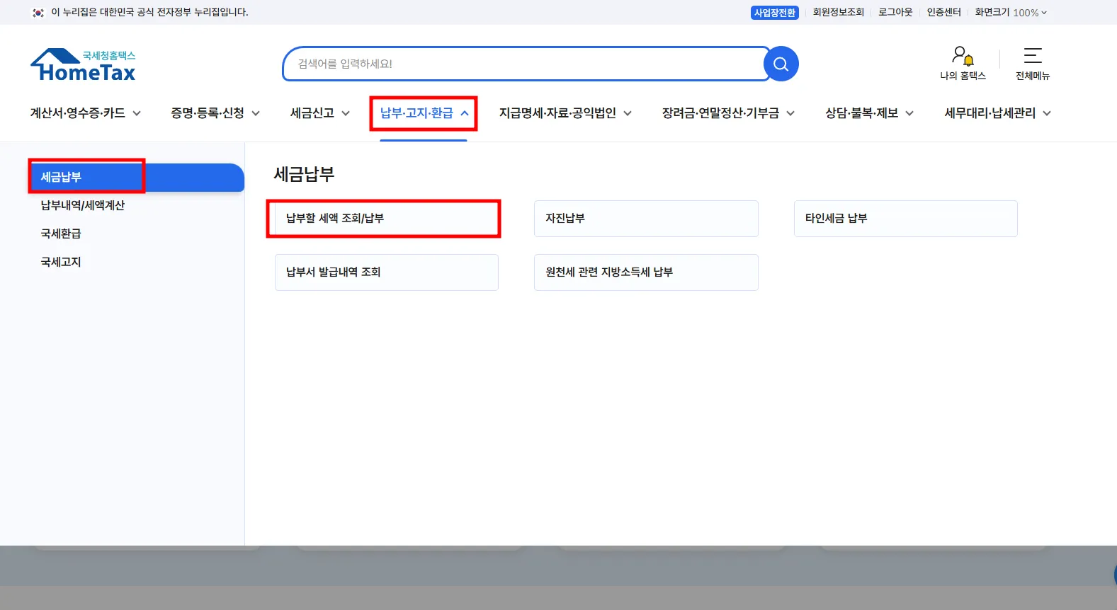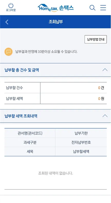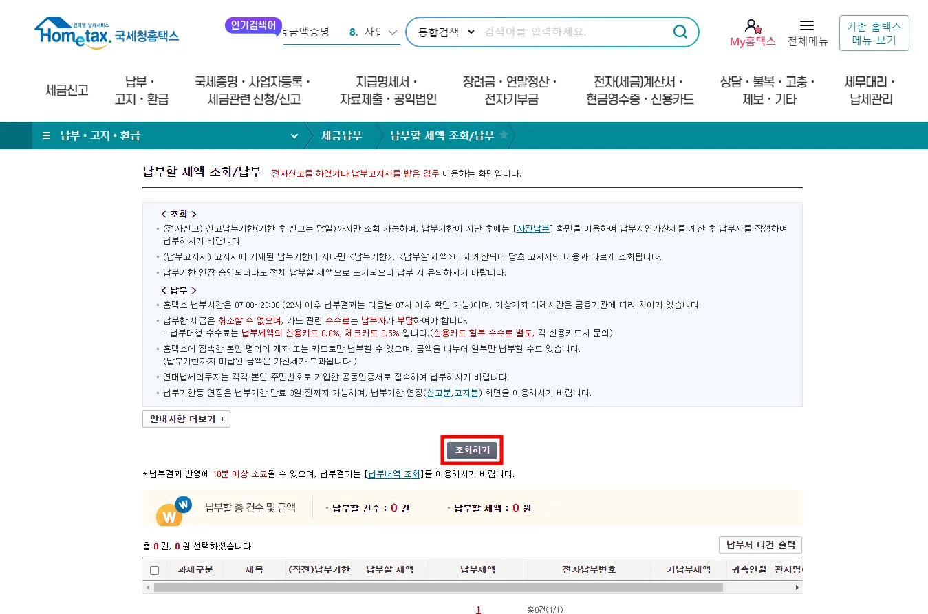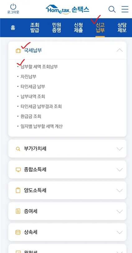 납부,고지,환급 → 세금납부 → 납부할 세액 조회납부