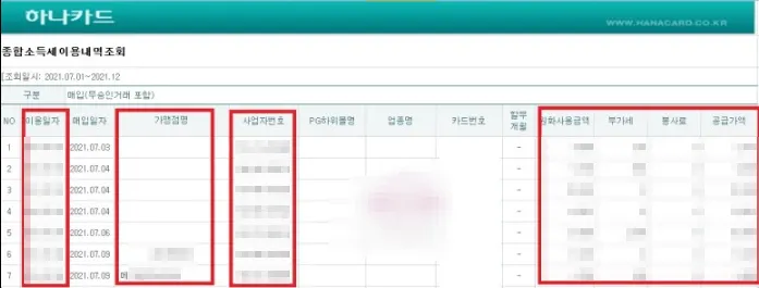 아래 이용 내역에서 이용 일자, 이용 금액, 가맹점명, 상대방 사업자등록번호를 확인하실 수 있습니다.