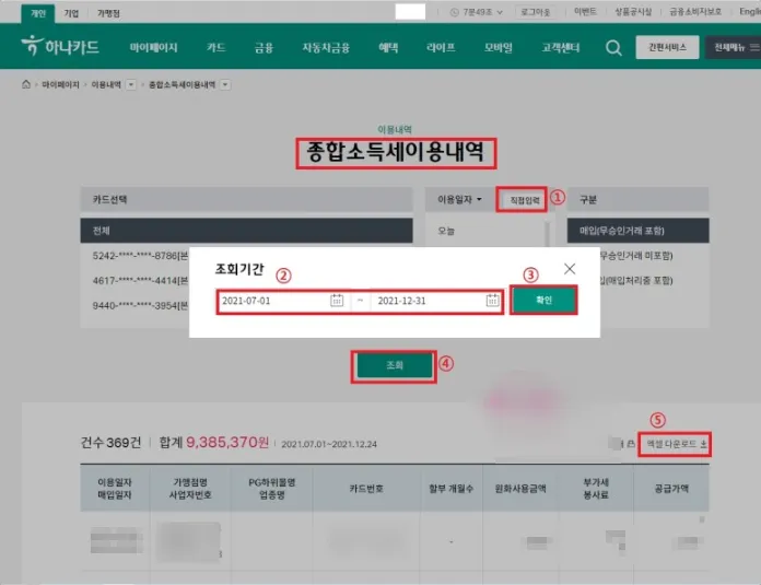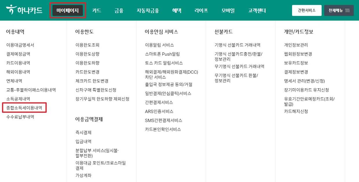 홈페이지 접속이 어려우신 분들은 하나카드 고객센터(1800-1111)에 전화하셔서 상담원 연결하신 뒤 "O월부터 O월까지 세금신고용 사용 내역을 이메일로 보내주세요"라고 말씀하셔도 됩니다.
