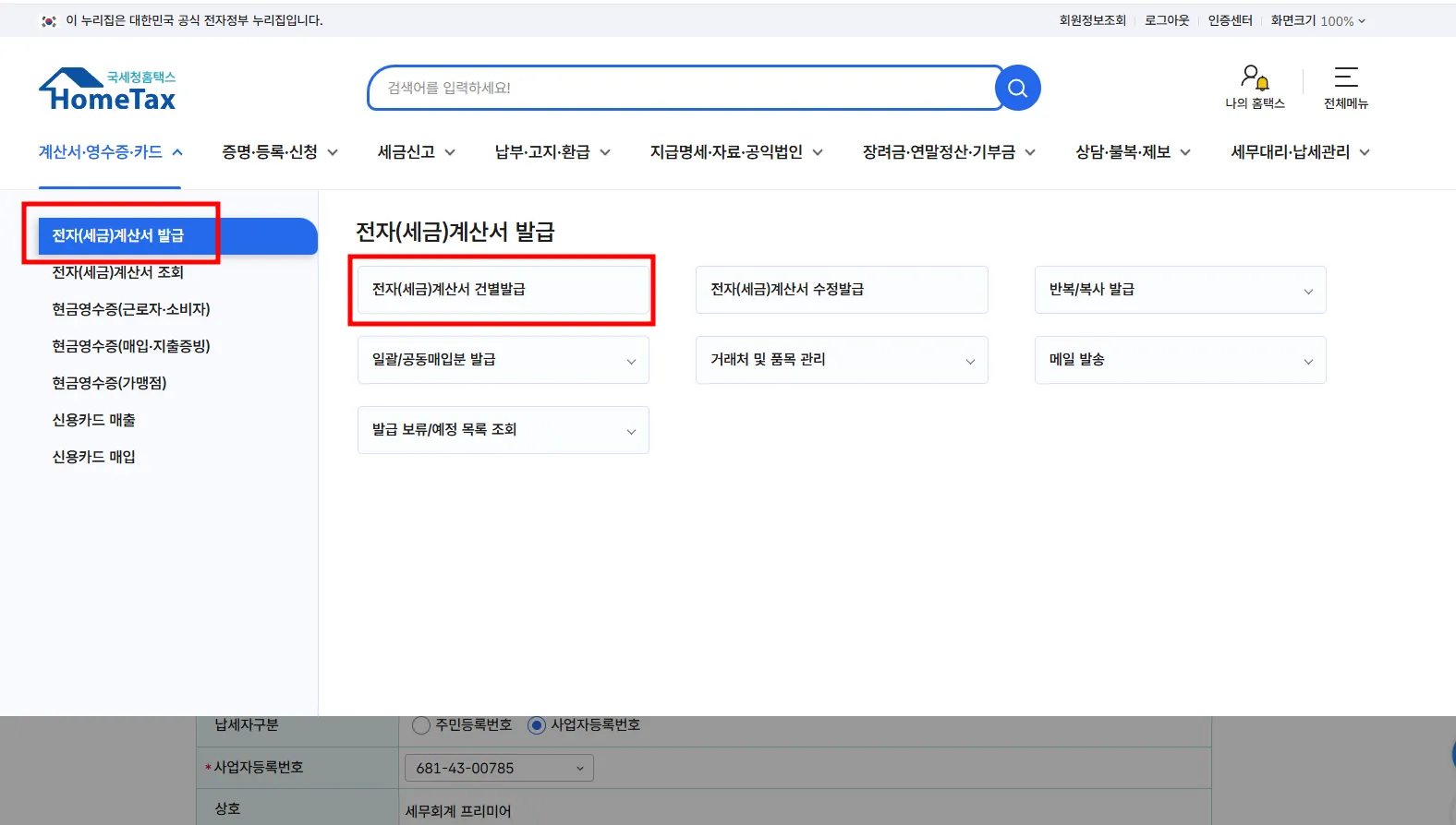 전자세금계산서/현금영수/신용카드 → 전자세금계산서 발급 → 건별발급
