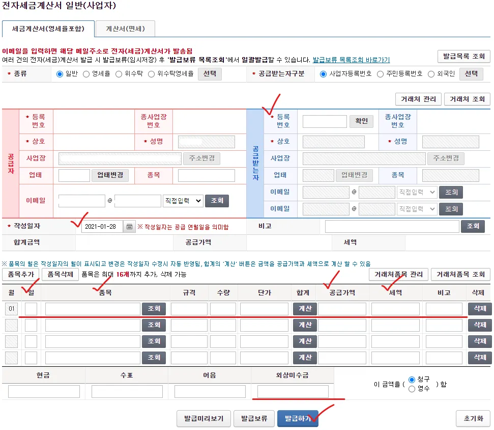 홈택스 로그인(공인인증서)→조회/발급→전자세금계산서→발급→건별발급→정보기입→