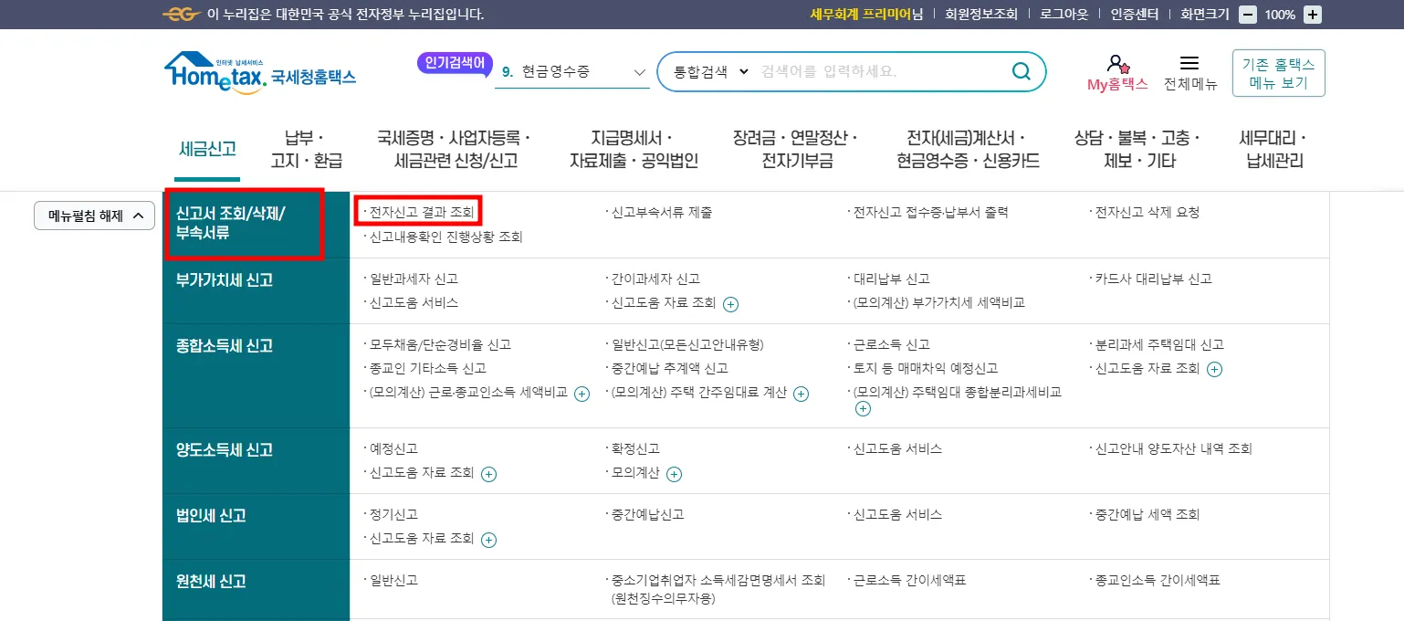 홈택스 로그인 후 [조회/발급] - [신고서 조회/삭제/부속서류] - [전자신고결과조회]를 눌러주세요.