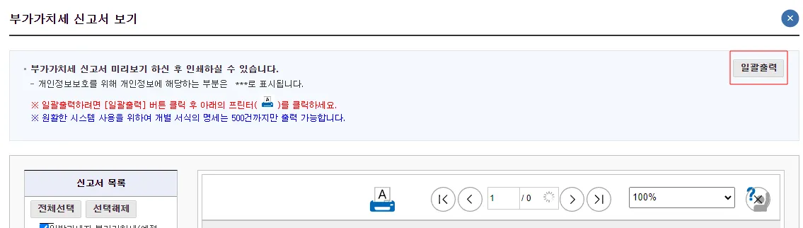 전체적인 내역을 조회하기 위해서 일괄출력 버튼을 클릭해서 전달해주시면 됩니다.
