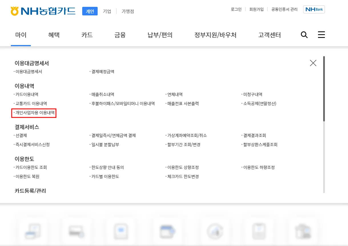 [마이] - [이용내역] - [개인사업자 이용내역]을 눌러주세요.