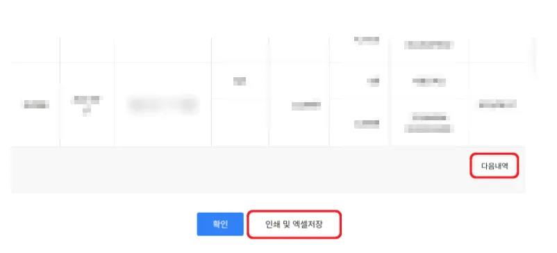 하단 [다음내역] 클릭후 마지막 페이지에서 [인쇄 및 엑셀저장]