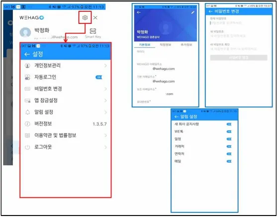 WEHAGO 모바일 화면 상단의 설정 아이콘(톱니바퀴 모양)을 이용하여 세부 설정메뉴로 이동합니다.