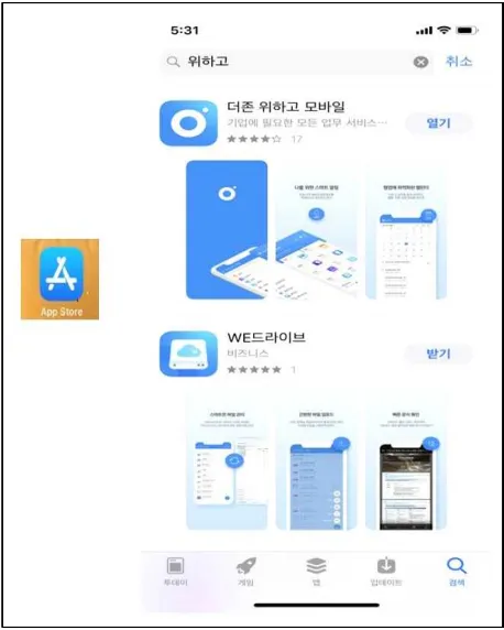 애플의 아이폰과 같은 ios 계열은 App Store에서 “WEHAGO” 또는 “위하고”를 검색하여 앱(App)을 설치합니다.