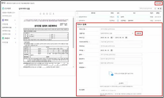 종이서류로 보관하던 회사의 중요한 계약 문서를 [계약서등록] 기능을 통해 상세한 계약 정보를 입력하고, 이미지 및 PDF파일을 첨부하여 보관할 수 있습니다.